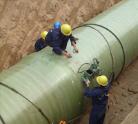 由計算機控制,在芯模上按規(guī)定的與纖維纏繞玻璃鋼管相同的工藝制造內(nèi)襯,凝膠后按設(shè)計好的線型和厚度纏繞結(jié)構(gòu)層,并將石英砂與樹脂混合的砂漿纏在結(jié)構(gòu)層中,再纏繞外保護層。