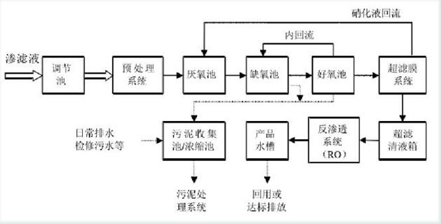 通過(guò)以上對(duì)垃圾滲濾液的各污染物分析及其水質(zhì)水量受當(dāng)?shù)貧夂蚝屠盥駡?chǎng)“年齡”的影響,對(duì)處理方法一一進(jìn)行說(shuō)明和比較,結(jié)合生活垃圾滲濾液的具體情況以及污水處理的目的、投資、占地面積、能耗、運(yùn)行費(fèi)用、管理方面程度、運(yùn)行可靠性及使用壽命等綜合因素的分析,以及我公司根據(jù)大量前期調(diào)研結(jié)果、吸收國(guó)內(nèi)外滲濾液處理的經(jīng)驗(yàn)并結(jié)合多年廢水治理的實(shí)踐經(jīng)驗(yàn),在進(jìn)行充分、合理分析污水處理系統(tǒng)運(yùn)行過(guò)程中將會(huì)出現(xiàn)的水質(zhì)沖擊負(fù)荷及當(dāng)?shù)氐木唧w氣候等情況后,特采用以下工藝: