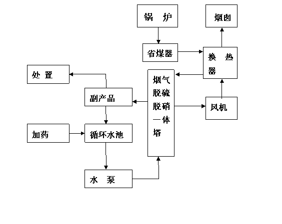 本方案設(shè)計(jì)流程:煙氣→余熱回收裝置(省煤器)→換熱器→除塵器→脫硝脫硫一體塔→換熱器→排放。(本流程僅供參考,我公司根據(jù)不同情況設(shè)計(jì)不同方案,但均以處理達(dá)標(biāo)、投資小、占地面積小、管理方便為宗旨)