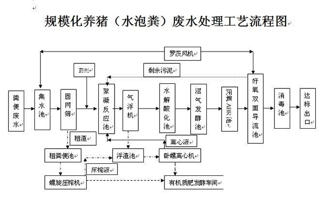 根據(jù)畜牧養(yǎng)殖場(chǎng)污水水質(zhì)特性及排水狀況(水沖糞工藝),在污水處理工藝前端要設(shè)置初沉池,以利糞便與污水初步分離,減少污水處理量。分離后的糞便和人工清除的糞便作堆積發(fā)酵處理后,加工成為有機(jī)肥出售或另作他用。